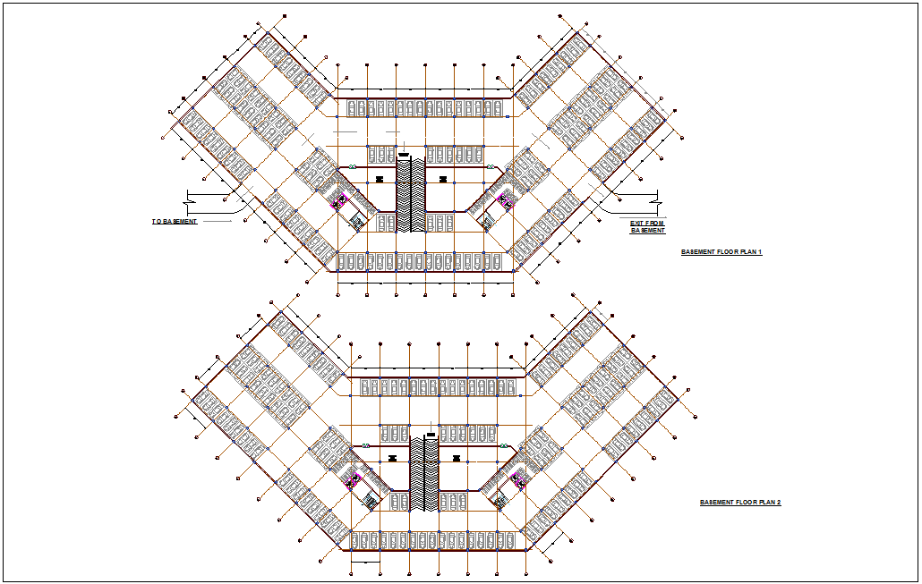 Basement floor plan of administration building with first and second floor plan dwg file in plan with view of area view with wall,wall support view,in-out way,column view with support and lot type system view of parking area with necessary detail and dimension.