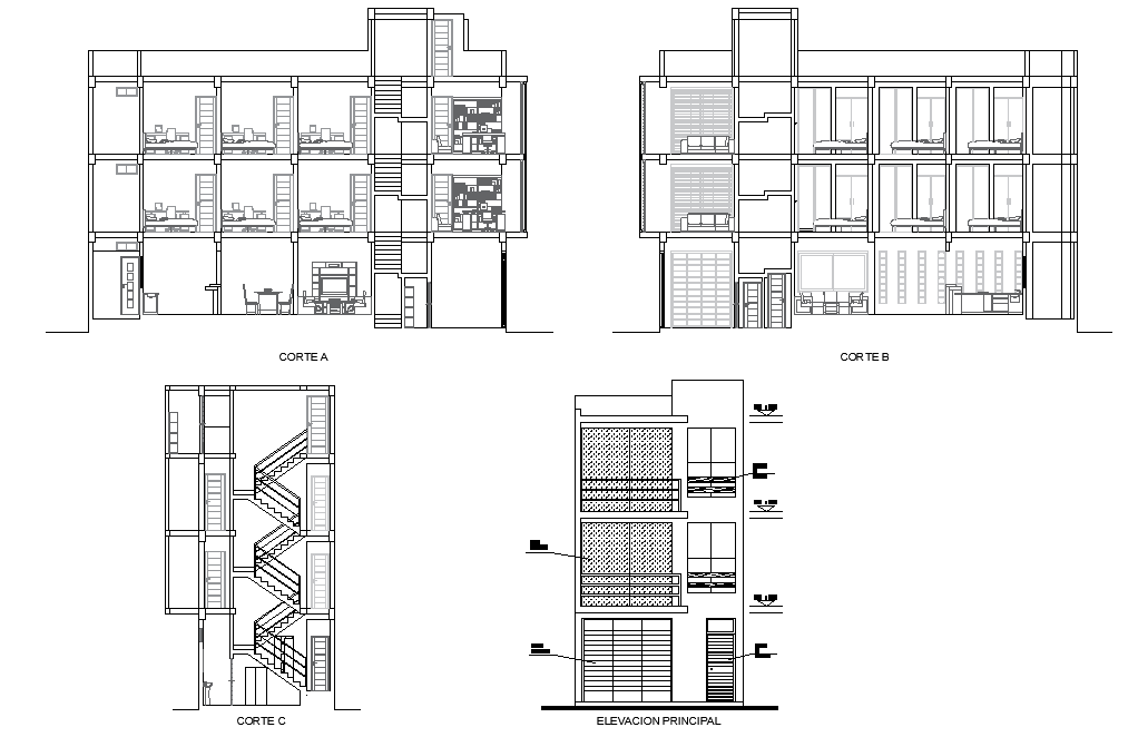 Elevation and section living place plan autocad file, front elevation detail, section A-A’ detail, section B-B’ detail, section C-C’ detail, leveling detail, stair detail, etc.