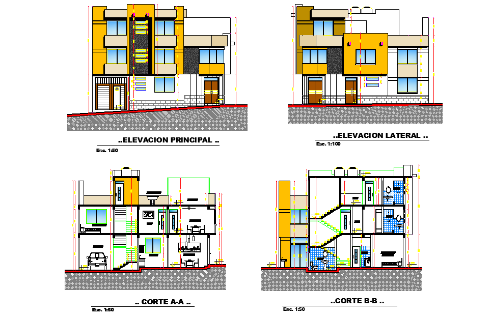 Elevation and section house plan autocad file, front elevation detail, side elevation detail, section A-A’ detail, section B-B’ detail, diemnsion detail, stair detail, car parking detail, furniture detail in toilet detail, etc.