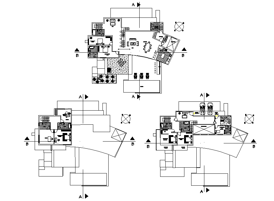 Beach house plan layout file, section lien detail, car parking detail, furniture detail in table, chair, bed, cubboard detail, north diection detail, toilet detail, etc.