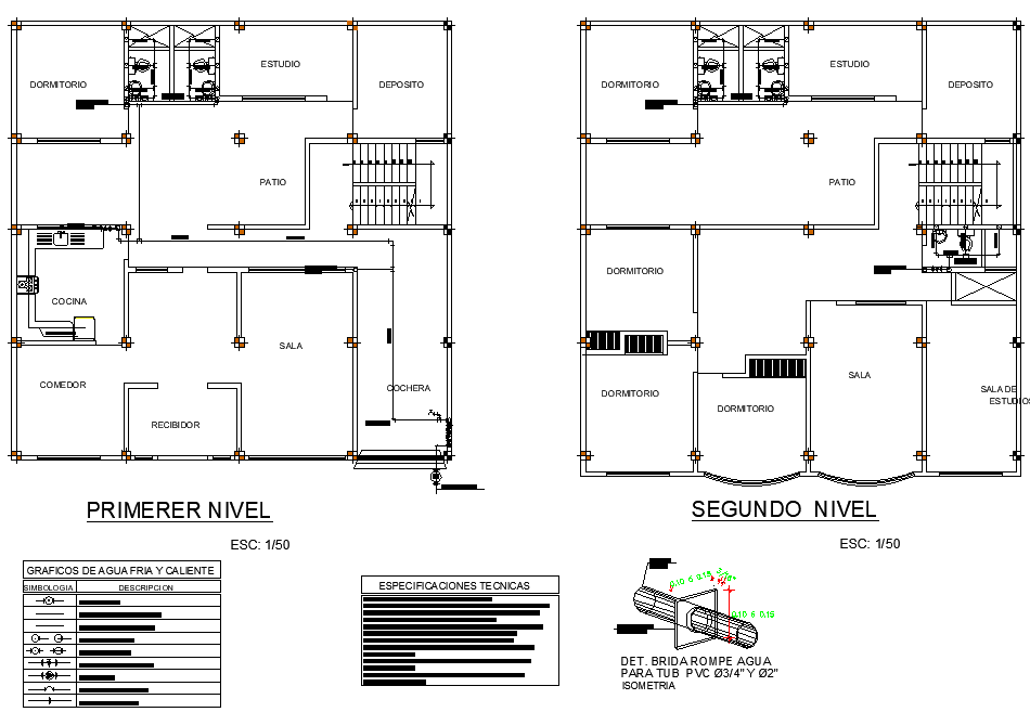 First floor and second floor house plan detail layout file, scale 1:50 detail, naming detail, stair detail, legend detail, specification detail, etc.