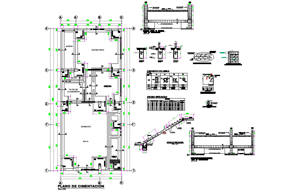 Foundation plan and section detail autocad file, stair section detail, centre line detail, diemnsion detail, naming detail, reinfrocemen tdetail, bolt nut detail, etc.