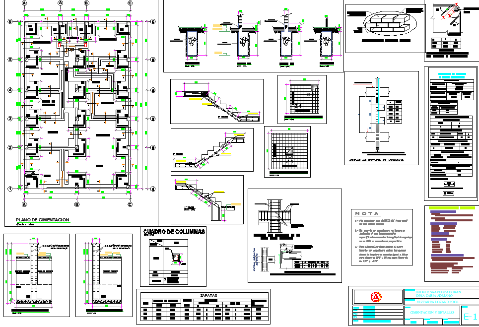 Foundation plan and section detail dwg file, centre lien detail, diemsnion detail, naming detail, reinfrocement detail, bolt nut detail, column and beam detail, etc.