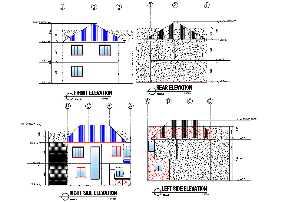 Elevation home plan autocad file, front elevation detail, rear elevation detail, right elevation detail, left elevation detail, centre line detail, diemnsion detail, leveling detail, namign detail, scale 1:100 detail, etc.
