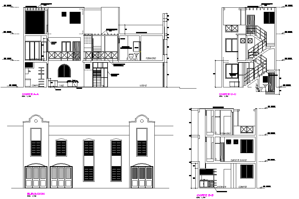 Section and elevation single family home plan autocad file, front elevation detail, section A-A’ detail, section B-B’ detail, section C-C’ detail, stair section detail, scale 1:100 detail, diemnsion detail, naming detail, leveling detail, etc.