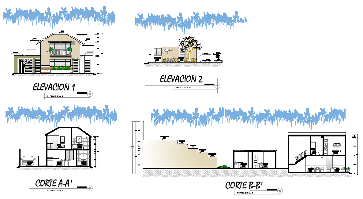 Elevation and section house with or chard detail layout file, front elevation detail, side elevation detail, section A-A’ detail, section B-B’ detail, diemnsion detail, namign detail, landsceping detail in tree and plant detail, etc.