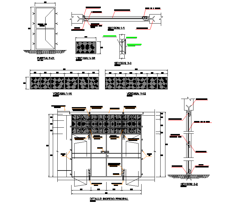 Door elevation and section plan detail dwg file, diemnsion detail, naming detail, section 1-1 detail, section 2-2 detail, etc.