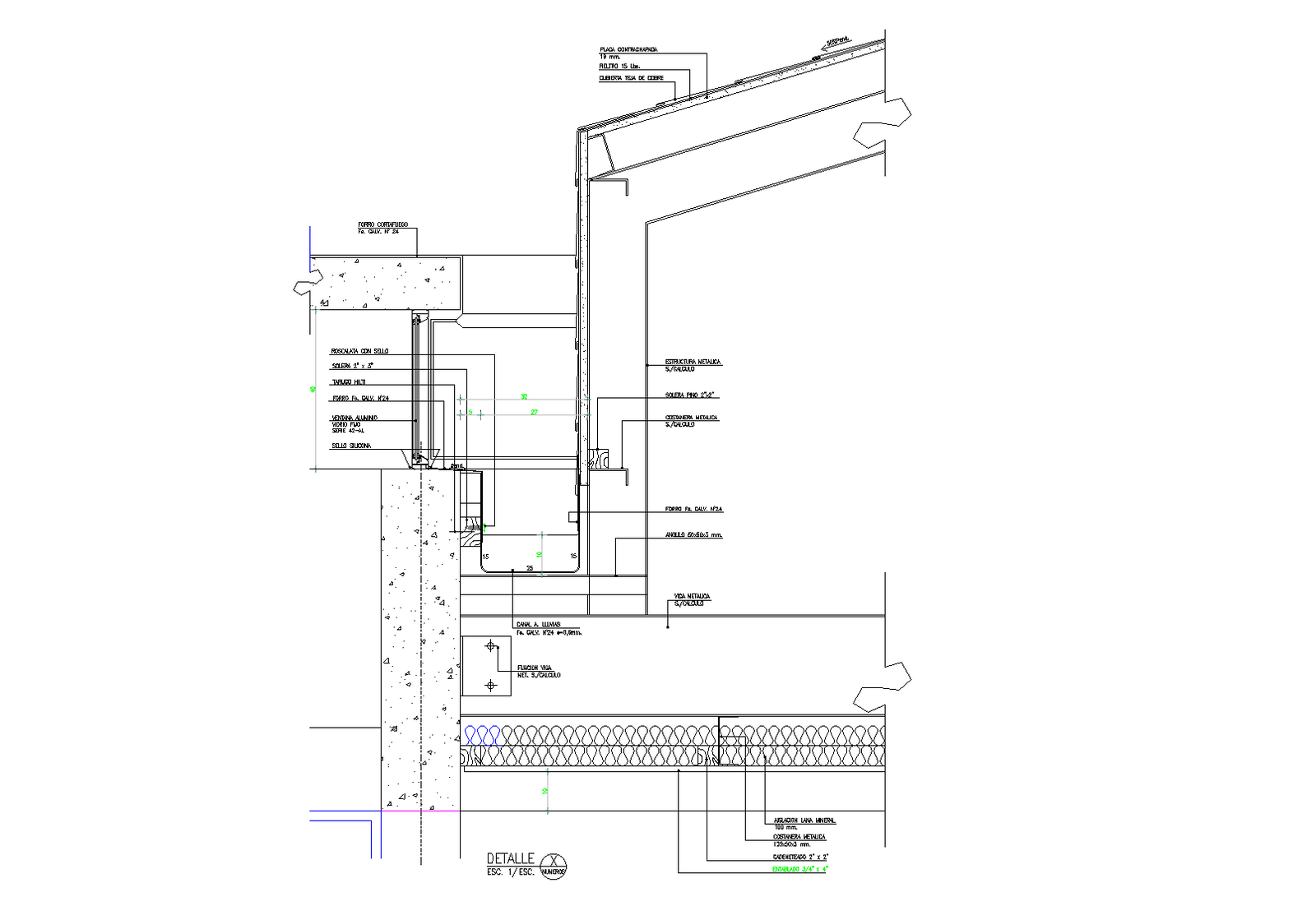 Section connection roof of copper tiles on wooden structuring gutter of drainage plan. sectional plan with detailing of a metallic structure, beam fixation, channel to rains, silicone seal, etc.,