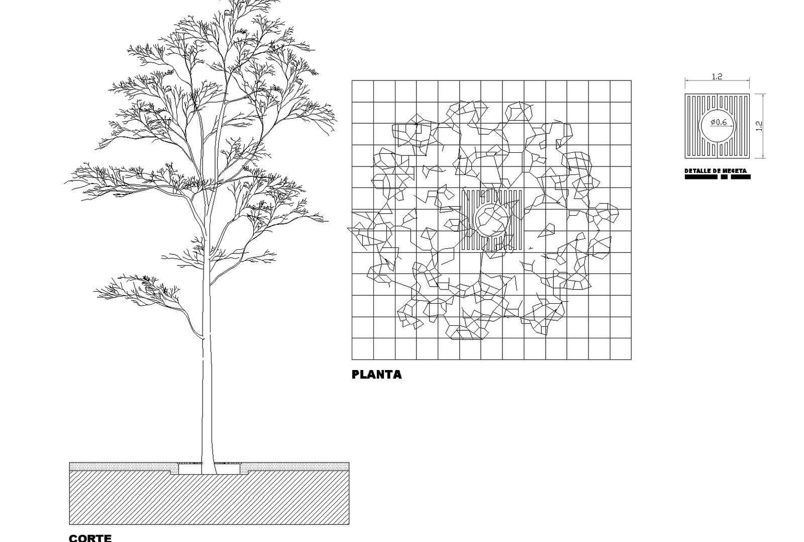 The base of a tree in urban walk plan. The top view plan with elevation with detailing.