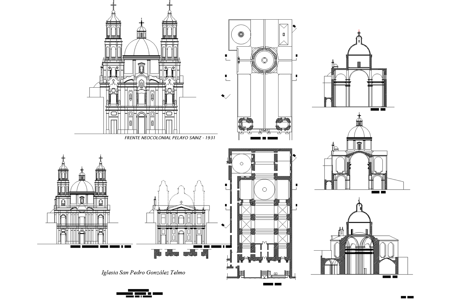 Sanpedrotelmo church plan. The top view plan with front, side, elevations. Detailed elevation and detailed plan are shown.