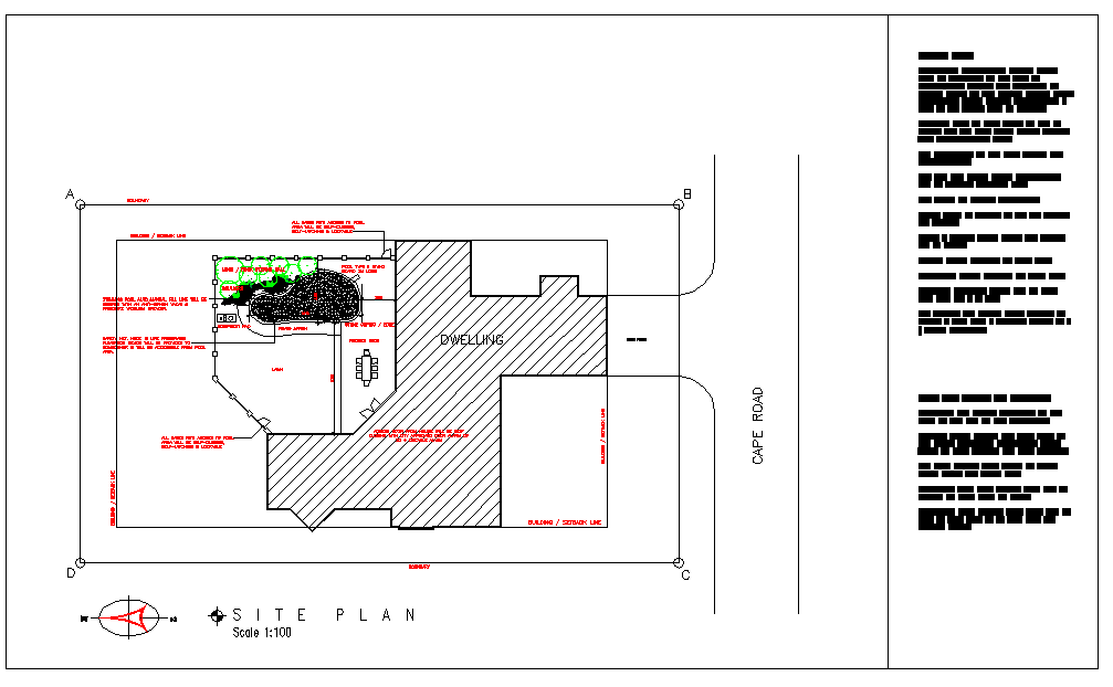 House Plan Lay-out detail with Plot Size, water surface = start depth, bond beam