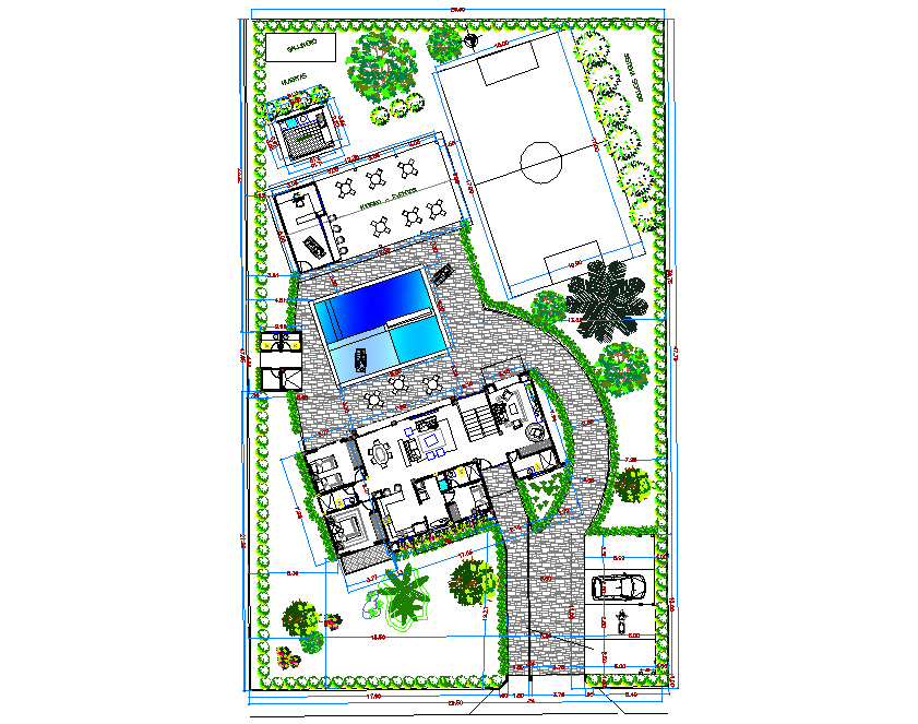 Landscaping layout house plan detail dwg file, car parking detail, dimension detail, naming detail, landscaping detail in tree and plant detail, furniture detail in door, bed, sofa, table, chair and window detail, etc.