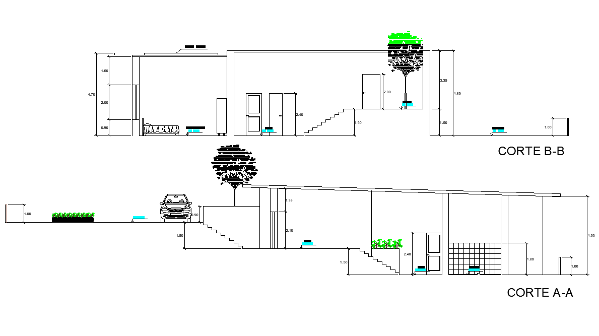 Section house plan autocad file, section A-A’ detail, section B-B’ detail, dimension detail, naming detail, levelling detail, car parking detail, furniture detail in door and window detail, landscaping detail in tree and plant detail, etc.