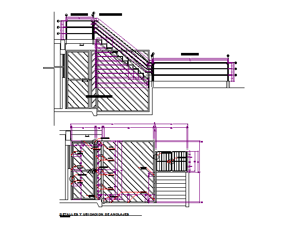 Staircase sectional details, front view of staircase is shown, with sectional details in auto cad format