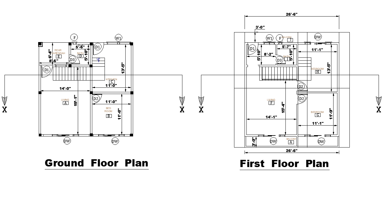 Ground floor and first floor house plan layout file, section line detail, door and window numbering detail, dimension detail, naming detail, stair detail, etc.