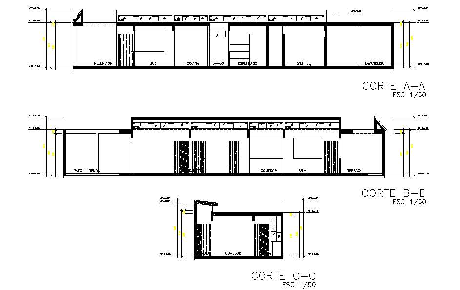 Section house plan detail dwg file, section A-A’ detail, section B-B’ detail, section C-C’ detail, dimension detail, leveling detail, scale 1:50 detail, etc.