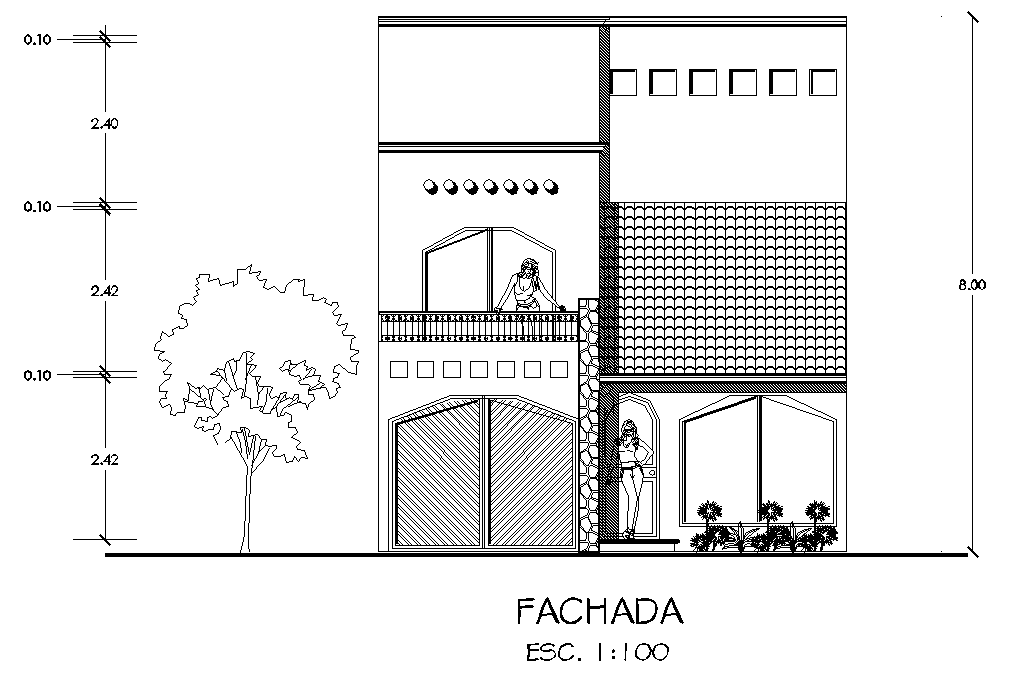 Front Elevation home plan layout file, dimension detail, naming detail, scale 1:100 detail, landscaping detail in tree and plant detail, furniture detail in door and window detail, etc.