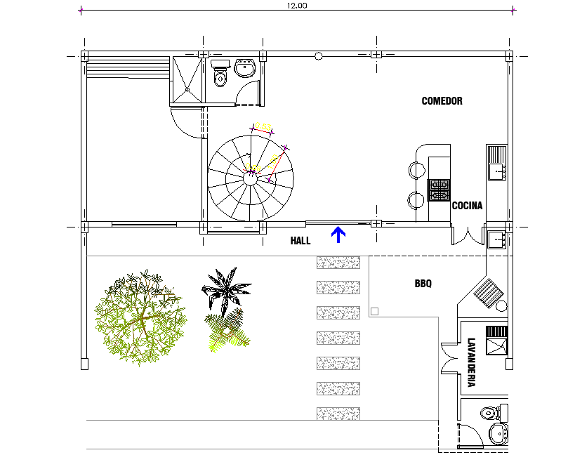 House plan detail layout file, spiral stair detail, dimension detail, naming detail, toilet detail, water closed detail, sink detail, landscaping detail in tree and plant detail, stair detail, cut out detail, etc.