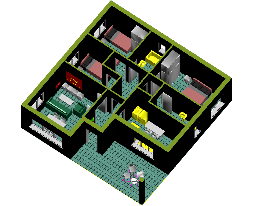 Family house 3 D plan layout file, furniture detail in door, window, sofa, bed, cub board, door and window detail, wall detail, etc.