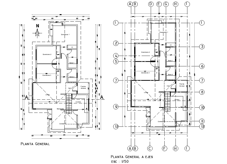 Working house plan detail, north direction detail, dimension detail, naming detail, stair detail, furniture detail in door and window detail, section lien detail, centre line detail, scale 1:50 detail, etc.