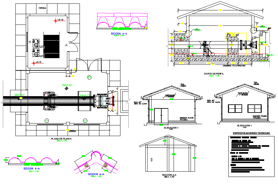 Chamber pipe line house detail dwg file, front elevation detail, side elevation detail, section A-A’ detail, section B-B’ detail, scale 1:50 detail, specification detail, leveling detail, etc.