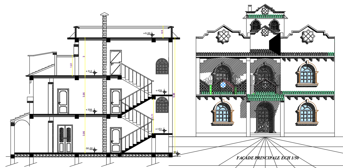Traditional concept building elevation, Bungalow elevation and top view layout plan, top view parking details, furniture details sectional elevation bungalow is shown,