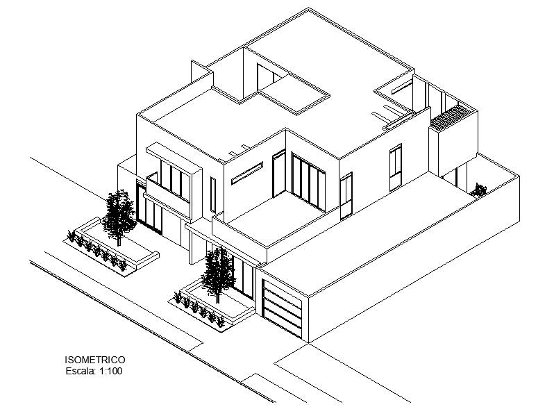 Isometric house view plan dwg file, and landscaping detail in tree and plant detail, furniture detail in door and window detail, etc.
