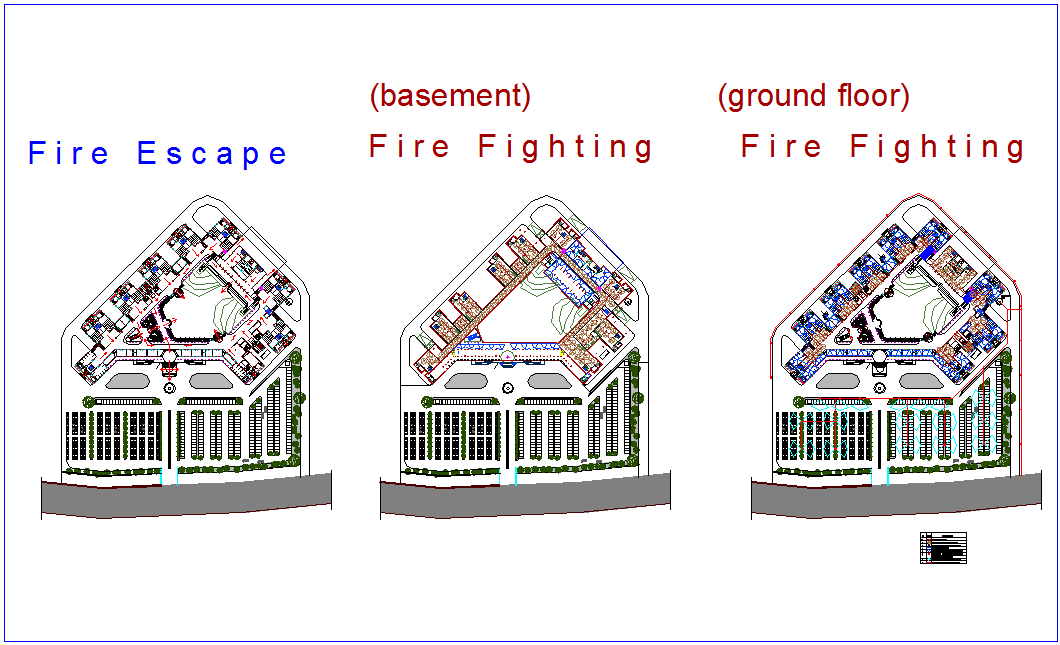 Court design with floor view and fire fighting dwg file in plan with basement view and view of ground floor with single line of C O 2 and view of fire fighting symbol.