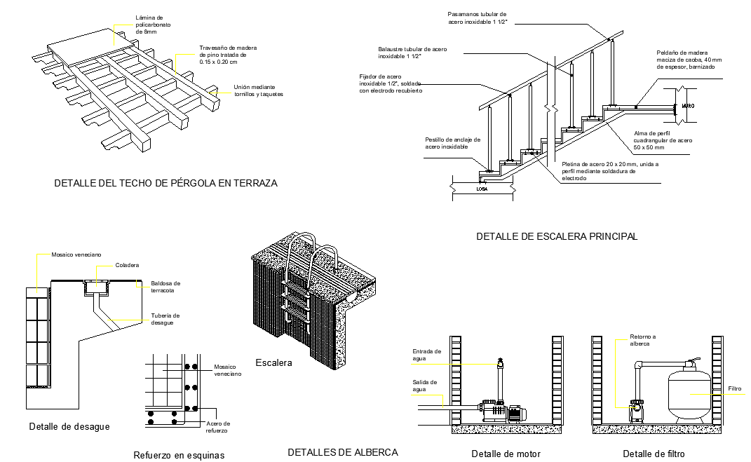Handrail section detail dwg file, filter elevation detail, detail of motor, reinforcement detail, dimension detail, naming detail, riser and tread detail, etc.