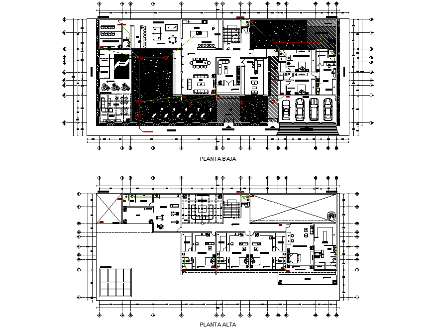 Working residential house layout file, centre lien detail, dimension detail, naming detail, furniture detail in table, chair, door, window, sofa and bed detail, stair detail, cut out detail, spiral stair detail, hatching detail, etc.