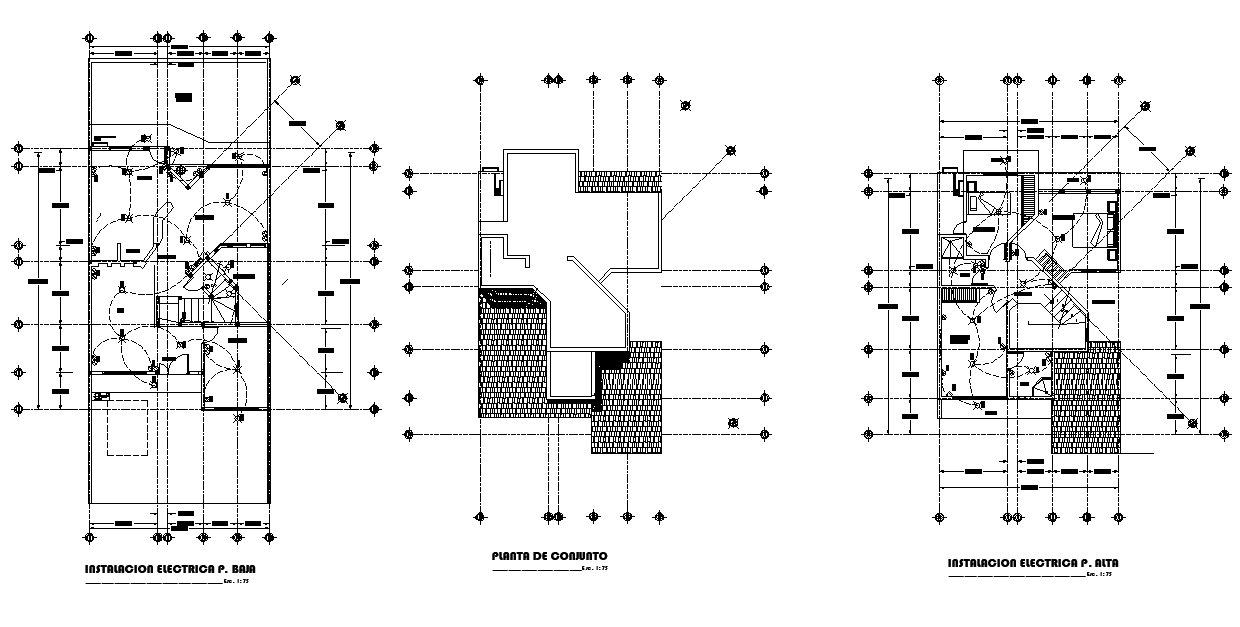 Electrical house plan detail dwg file, dimension detail, naming detail, centre lien detail, sacle 1:75 detail, etc.