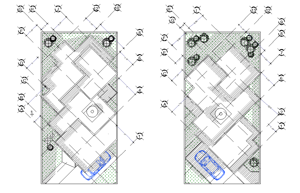 Roof house plan detail dwg file, centre line detail, dimension detail, car parking detail, landscaping detail in tree and plant detail, etc.