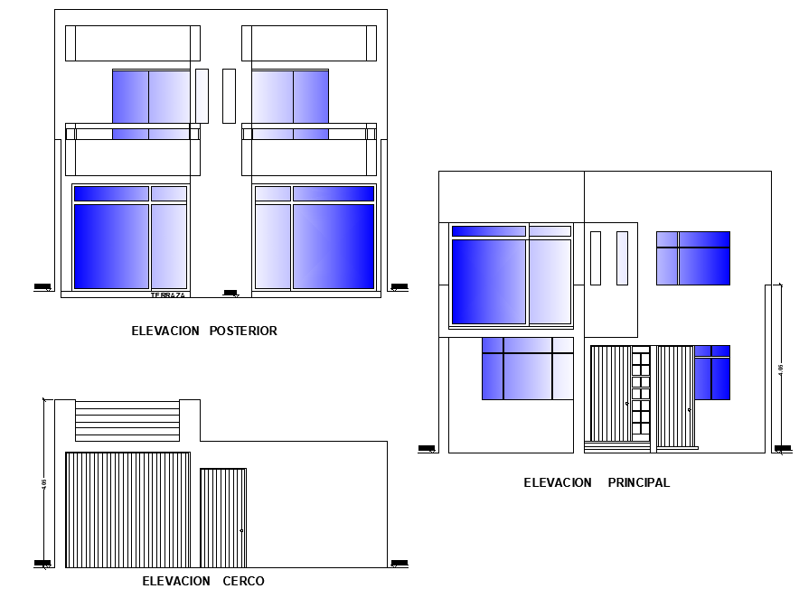 Elevation beach house autocad file, front elevation detail, right elevation detail, left elevation detail, dimension detail, furniture detail in door and window detail, leveling detail, etc.