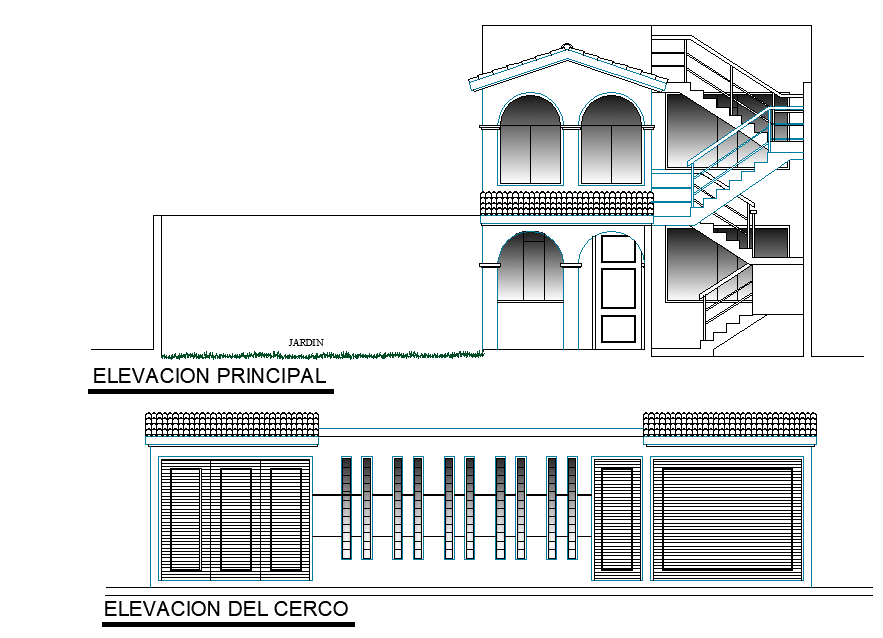 Elevation house plan detail, front elevation detail, side elevation detail, stair detail, furniture detail in door and window detail, roof detail, etc.