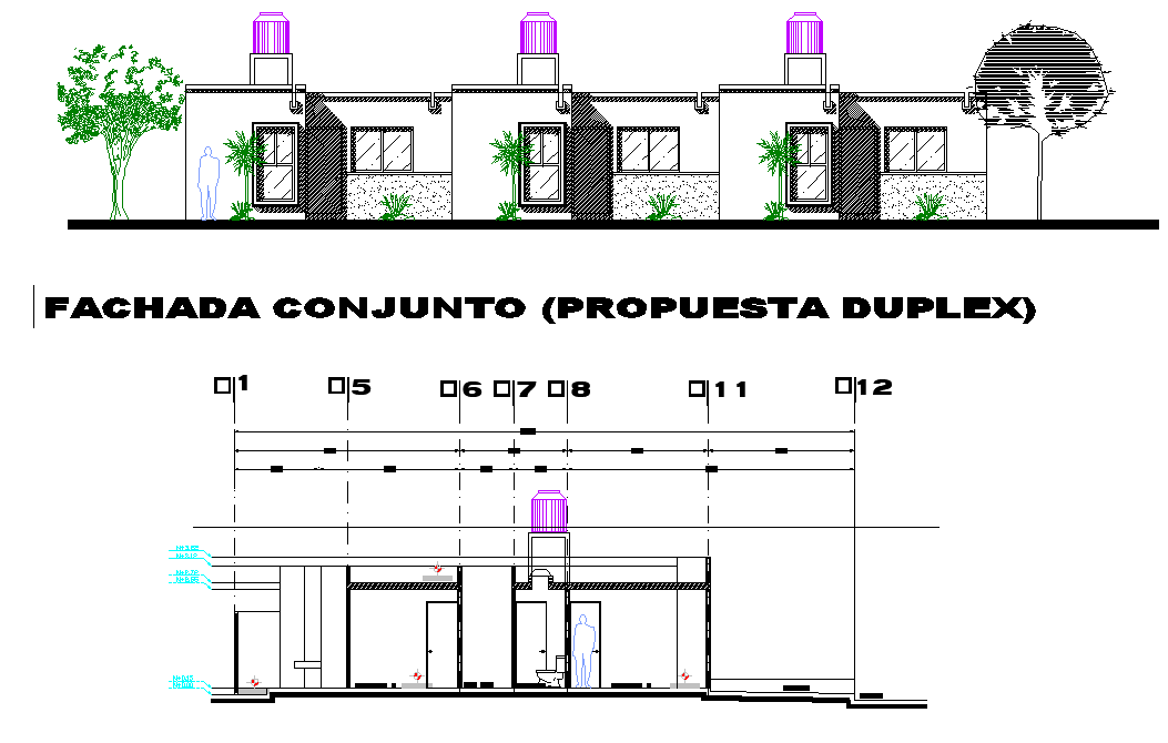 Elevation and section house plan autocad file, front elevation detail, section A-A’ detail, centre lien detail, dimension detail, landscaping detail in tree and plant detail, furniture detail in door and window detail, etc.