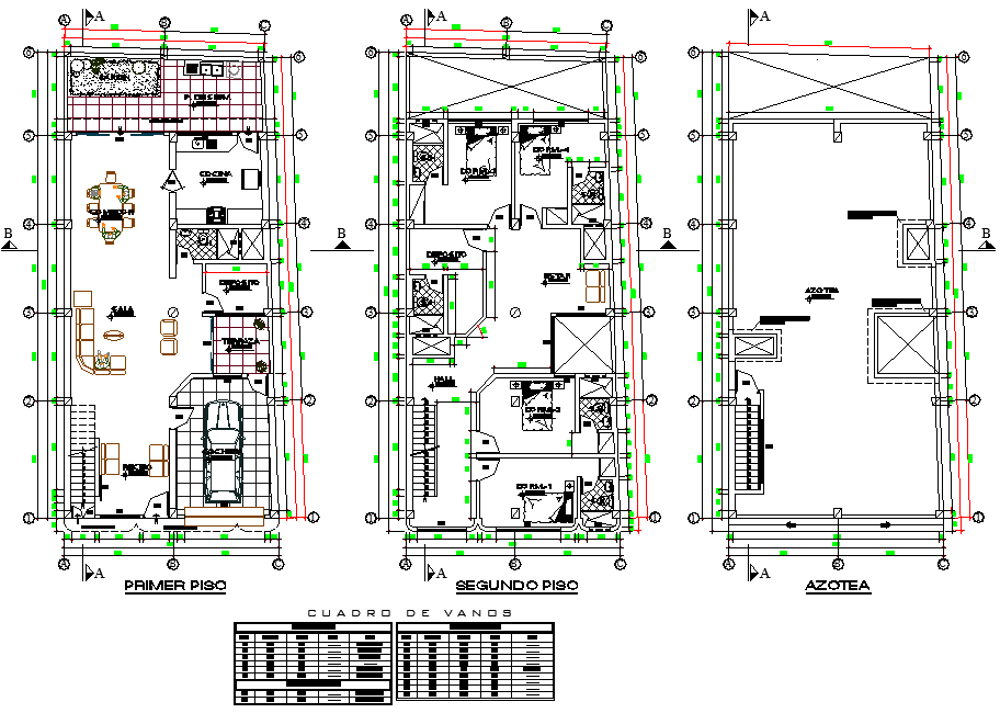 Single family home plan layout file, dimension detail, naming detail, ground floor to tarrace floor plan detail, furniture detail in table, chair, bed, sofa, door and window detail, specification detail, cut out detail, car parking detail, etc.