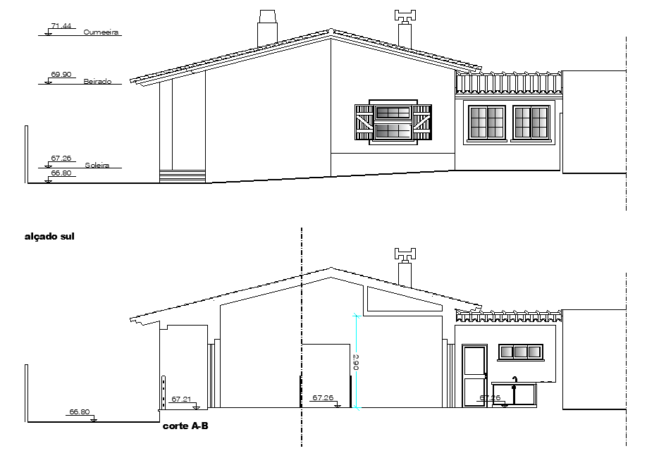 Section house plan detail dwg file, section A-A’ detail, section B-B’ detail, leveling detail, section line detail, chimney detail, furniture detail in door and window detail, etc.