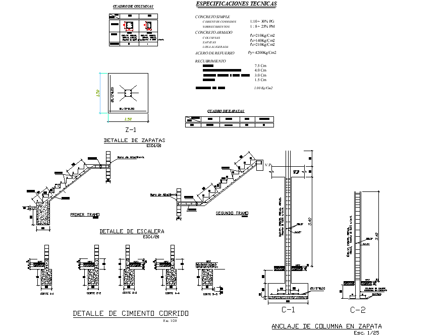Foundation section plan detail autocad file, stair section detail, specification detail, column section detail, reinforcement detail, etc.