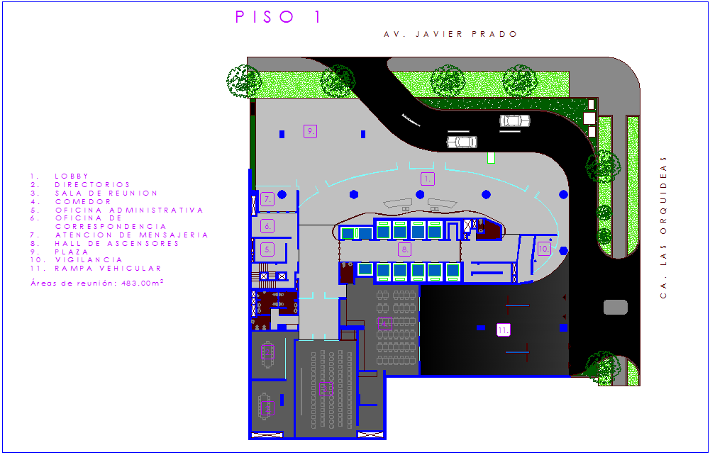 vehicle view on road and tree view and view of lobby,director office and plaza,hall,general office meeting room,washing area and door view with numbering detail view of office area.
