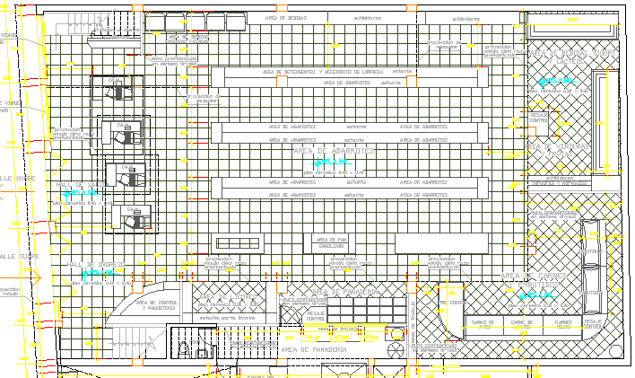 Super market structural layout plan details that includes a detailed view of car parking space, showrooms, shops, offices, toilets and bathroom, sitting area, passage, indoor stairs and much more of super market project.