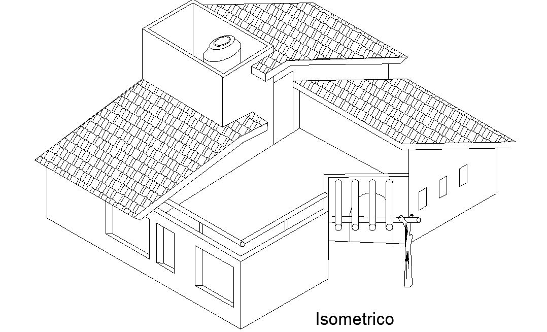 Isometric view house plan layout file, roof plan detail, furniture detail in door and window detail, gate detail, tank detail, etc.