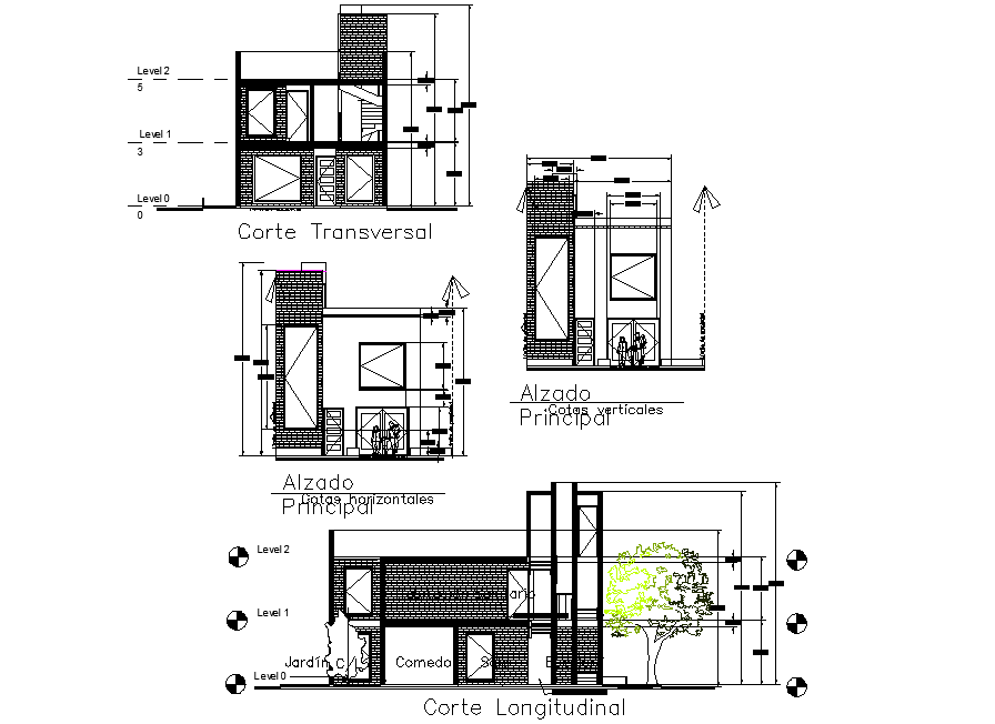 Section and elevation house plan detail, front elevation detail, side elevation detail, section A-A’ detail, section B-B’ detail, dimension detail, naming detail, etc.