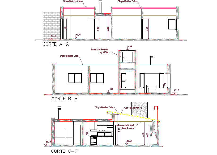 Section cottage plan detail dwg file, section A-A’ detail, section B-B’ detail, section C-C’ detail, leveling detail, furniture detail in door and window detail, naming detail, dimension detail, etc.