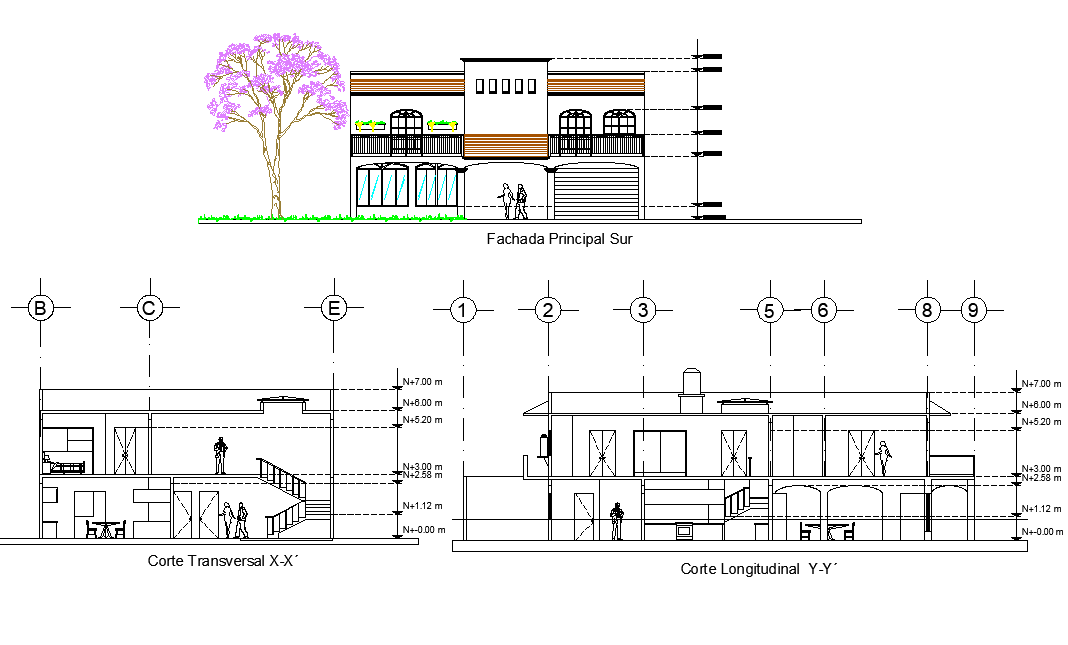 Elevation and section home plan layout file, front elevation detail, section X-X’ detail, section Y-Y’ detail, centre lien detail, leveling detail, stair detail, landscaping detail in tree and plant detail, furniture detail in door and window detail, etc.
