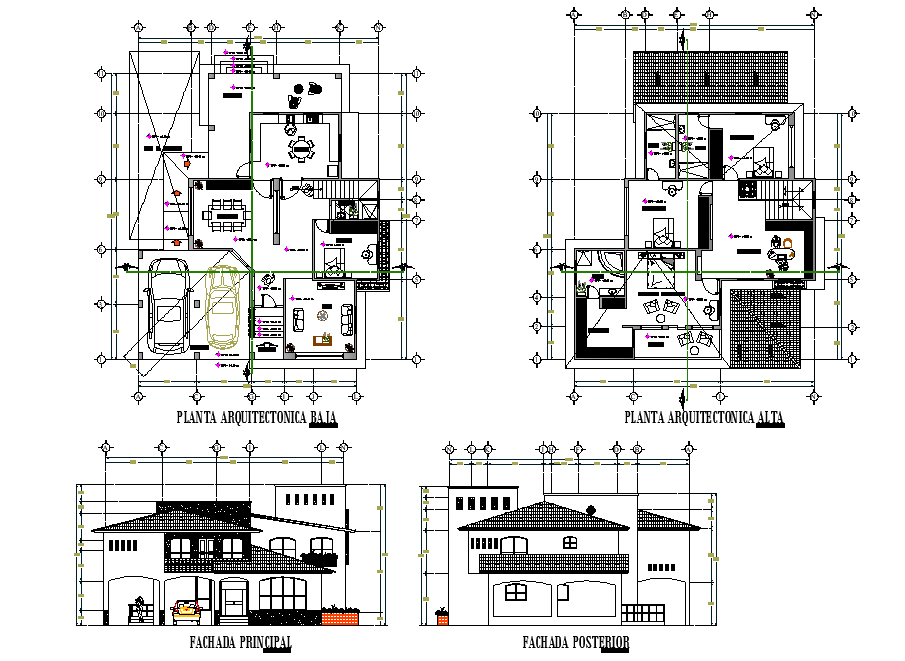 Plan and elevation home plan detail dwg file, centre lien plan detail, dimension detail, naming detail, furniture detail in door, window, sofa, table and chair detail, landscaping detail in tree and plant detail, etc.