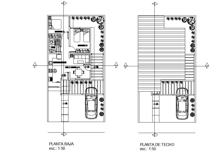 Single family house plan layout file, section lien detail, landscaping detail in tree and plant detail, car parking detail, furniture detail in door, window, sofa, table, chair and bed detail, toilet detail, etc.