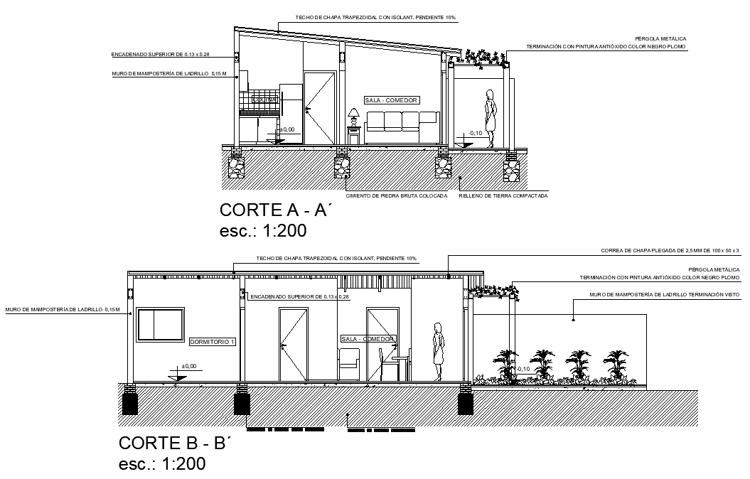 Section single family home plan autocad file, section A-A’ detail, section B-B’ detail, scale 1:200 detail, leveling detail, landscaping detail in tree and plant detail, furniture detail in door and window detail, etc.