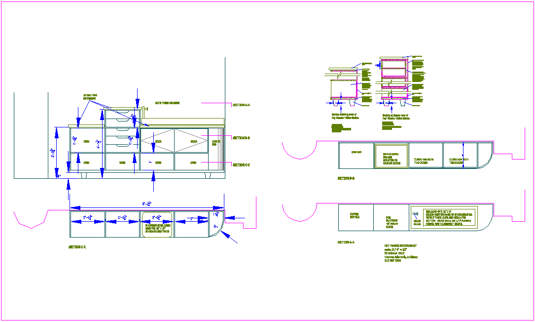 Section view of furniture of bar for office dwg file in section view with view of different detail of office bar with cabinet view of height and width view with drawer and view of coffee service area with table view with necessary dimension.
