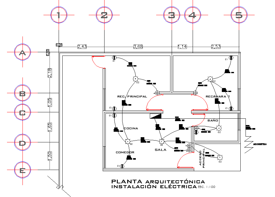 Electrical house plan detail dwg file, centre lien plan detail, dimension detail, naming detail, scale 1:100 detail, furniture detail in door and window detail, etc.