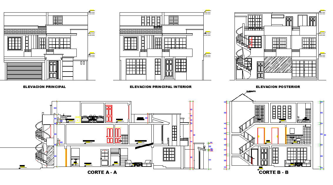 Detail of elevation and section home plan layout file, front elevation detail, right elevation detail, left elevation detail, section A-A’ detail, section B-B’ detail, leveling detail, dimension detail, naming detail, stair detail, etc.